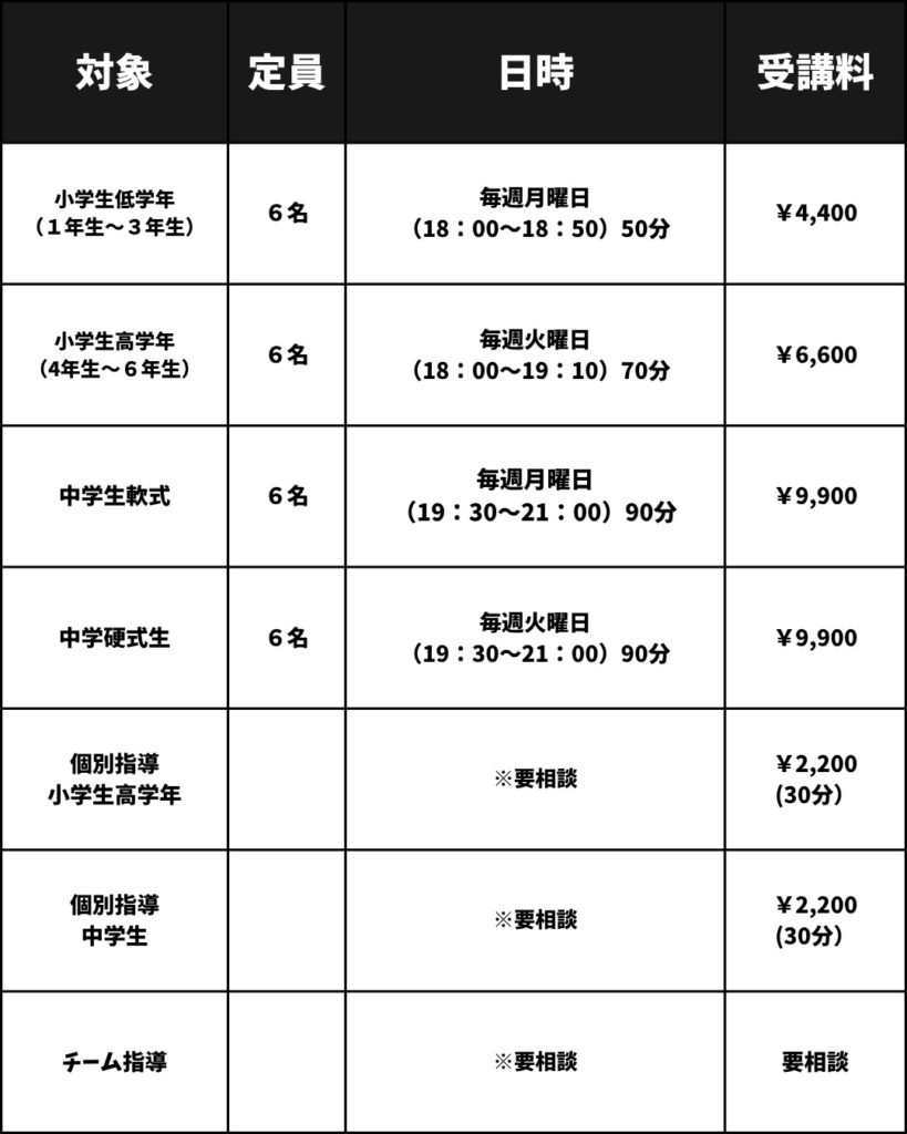 ※各コース人数調整の為クラス分けを行う場合がございます。(その場合人数調整と曜日を変更する場合がございます。)